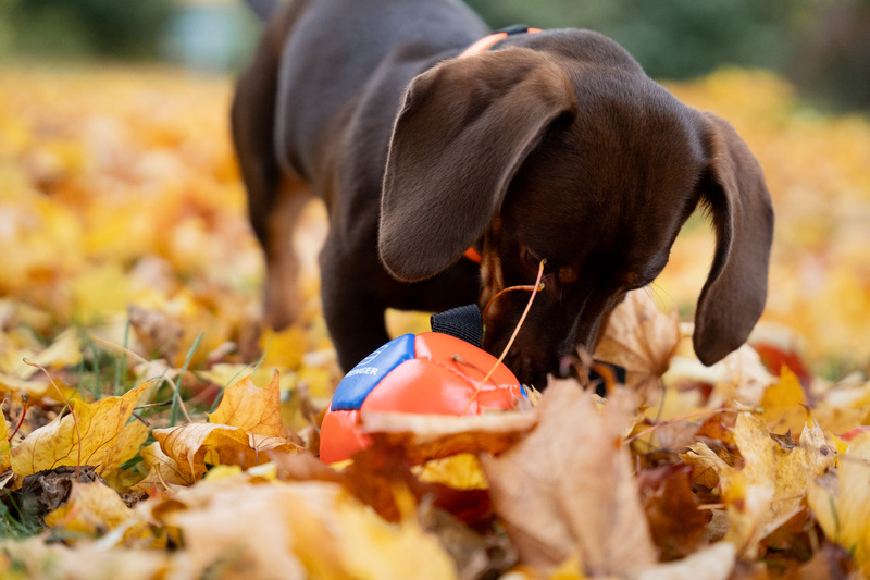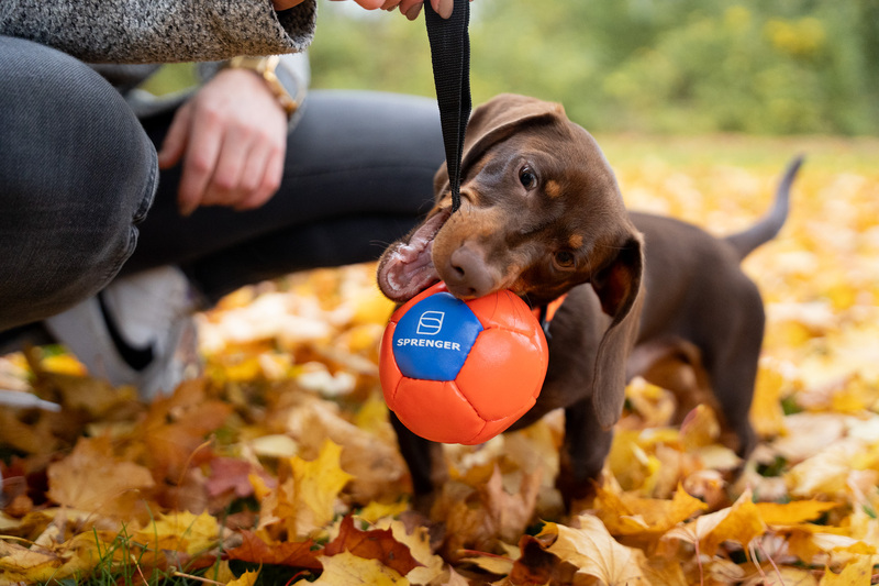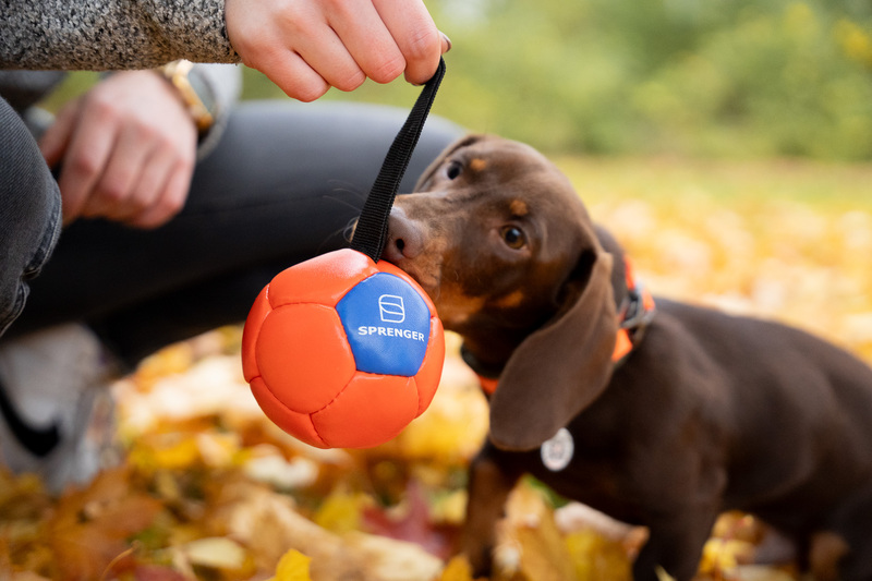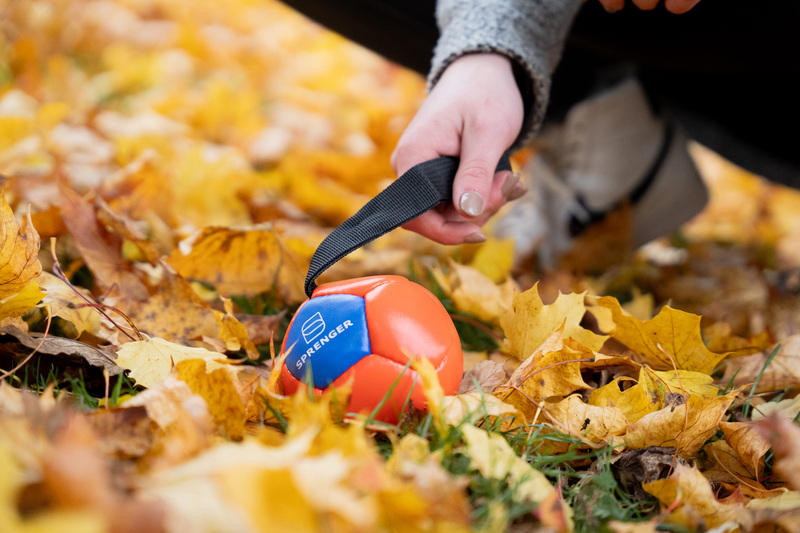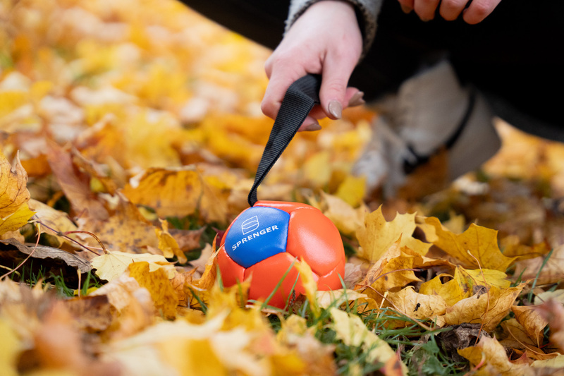 The high-quality SPRENGER logo can be found on the front and back of the ball. The vegan leather ball is available in three practical sizes: 10 cm, 12 cm, and 18 cm – so there is something for every size of dog.