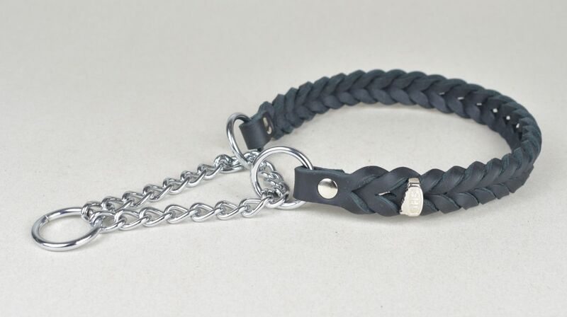 Pletené obojky z hrubej kože s chrómovou retiazkou.
