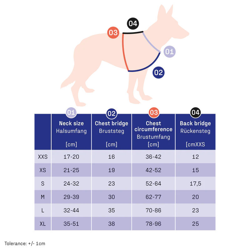 To help you choose the right size, you will find sample breeds for the respective sizes here. You can also find the exact measurements in the size chart: