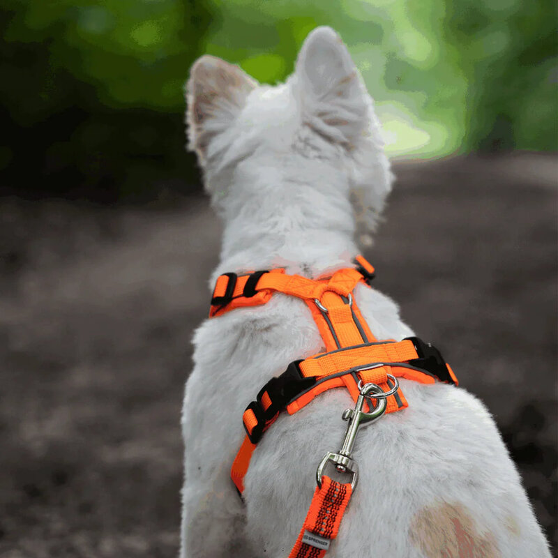 The smooth softshell padding (also under the high-quality Duraloc buckles) dries quickly, prevents rubbing and ensures a high level of comfort even for short-haired dog breeds and when worn for long durations. The robust harness material not only impresses with its high breaking strength, but also with its high color strength and a discreet shine. Whether you opt for the neon orange harness for maximum visibility or a classic all-black look: the reflective edging ensures greater visibility in traffic and thus increases safety on walks in the dark or at dusk.